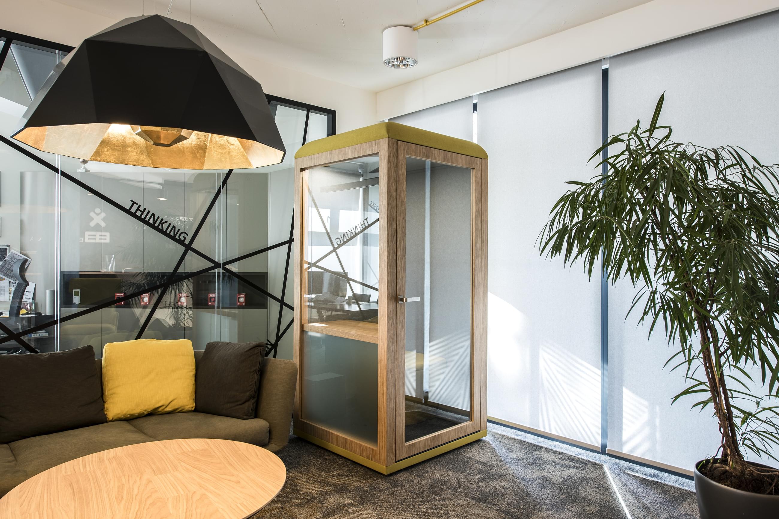 A micro office is a small, soundproofed room where employees can retreat when they need to make a call or discuss something in private. Size options are available in which one, two or even up to four people can escape from office noise. Micro offices are also a great opportunity for employees to do undisturbed work when they are stressed and need a break from the hustle and bustle of the office. Most micro offices are in the form of a phone booth with its own air-conditioning, lighting and a socket for connecting a laptop.