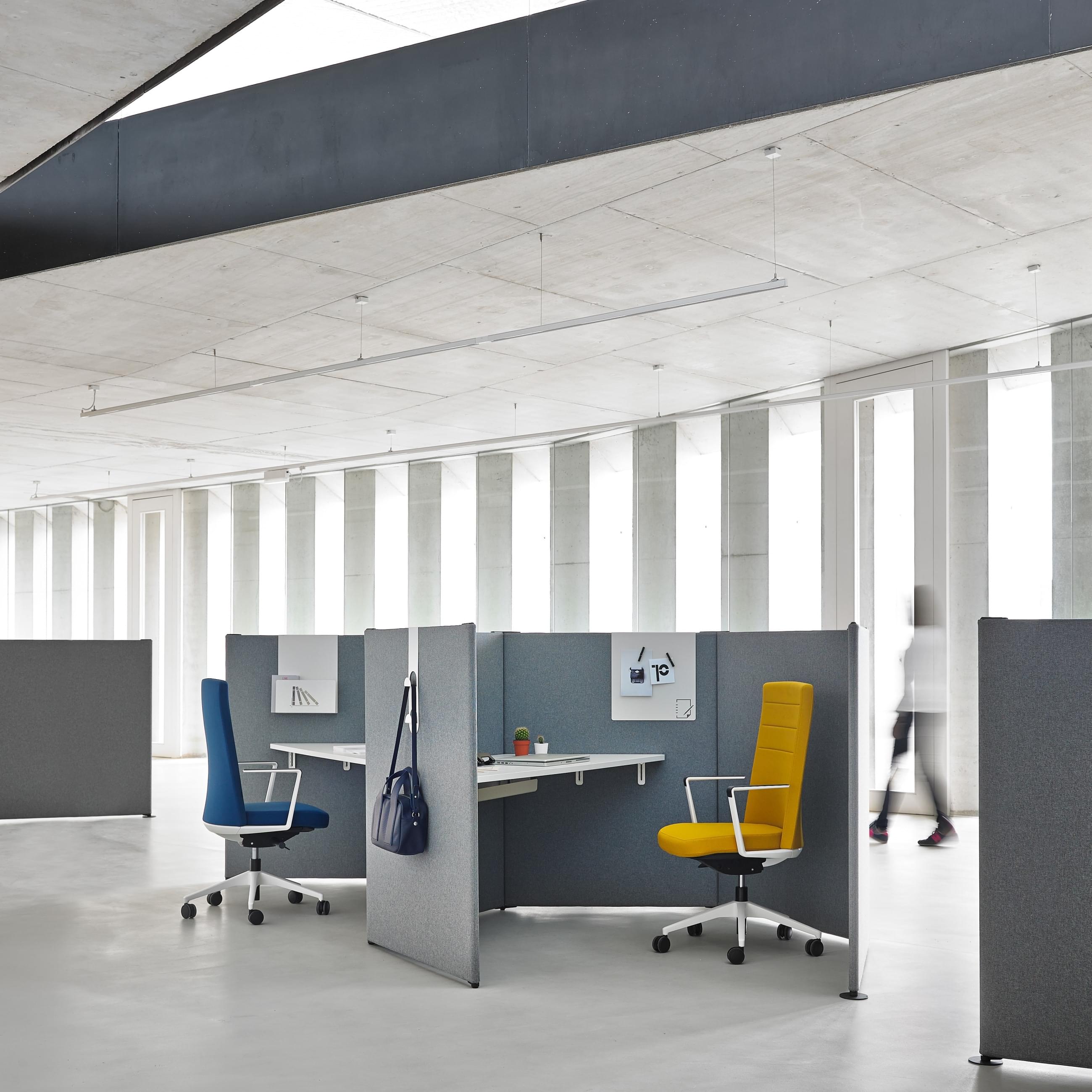 Most often they are placed either freely in the space or directly on desks. Free-standing screens can be flexibly moved at any time. Hanging screens soundproof open space without requiring construction interventions. Slatted screens make it easy to adjust the level of privacy by swivelling the slat.