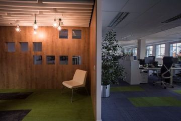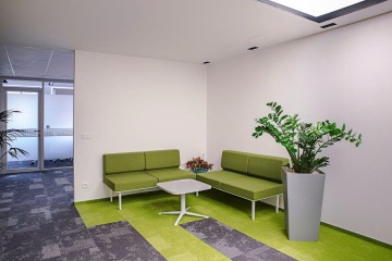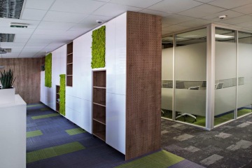 An interesting element in the design concept is mummified green moss on the walls, which literally brings the interiors to life. The whole area is equipped by a combination of furniture in white and brown wood decor with carpets in corporate colors. The carpet tiles have very interesting details that underline the whole interior. The supplier of carpets is our partner VOXFLOR. Most of the furniture was custom made. The chairs are made by the Spanish manufacturer ACTIU.