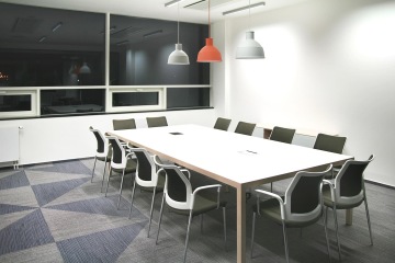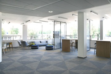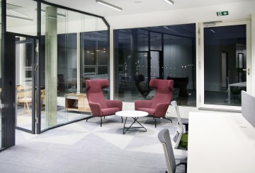 V dalších částech haly je neformální sezení od výrobců Softline a Muuto, jež je od zbylého prostoru lehce odděleno stěnami z tahokovu. Koberce na podlaze zpestřují části z vyřezaných barevných trojúhelníků.