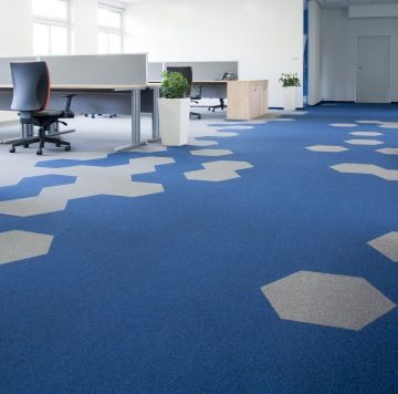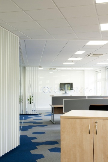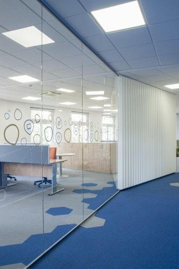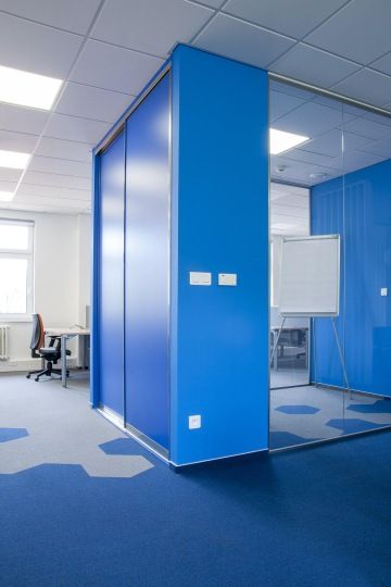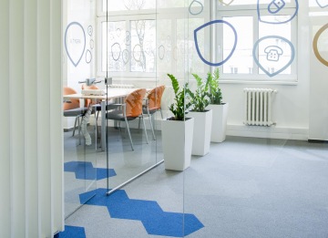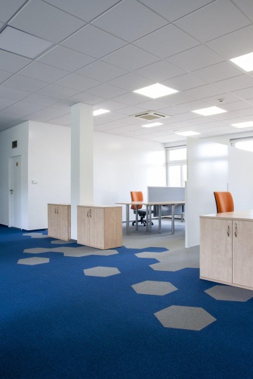 Na přání klienta je celý prostor laděn do modré a oranžové barvy. Zajímavým prvkem jsou především kobercové dlaždice VOXFLOR z kolekce Husar ve tvaru hexagonu nebo korporátní polepy na skleněných příčkách.