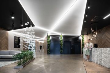 V moderní administrativní budově River Corner na pražském Smíchově, ve které se nachází nové kanceláře společnosti CAPEXUS i soukromá klinika VasMedic, jsme vybudovali recepci a působivé lobby.