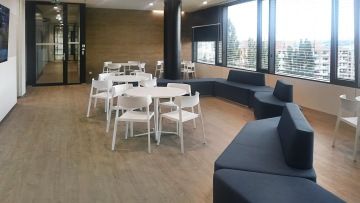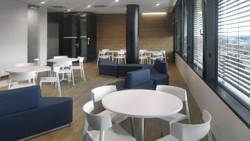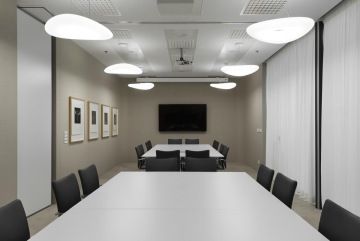 Zmíněné stoly Arkitek také dominují v jednacích místnostech a jsou doplněny židlemi Ikara. Vedle nábytku Actiu byly použity luxusní pohovky a křesla od společností Arper, LaCividina a Tacchini.